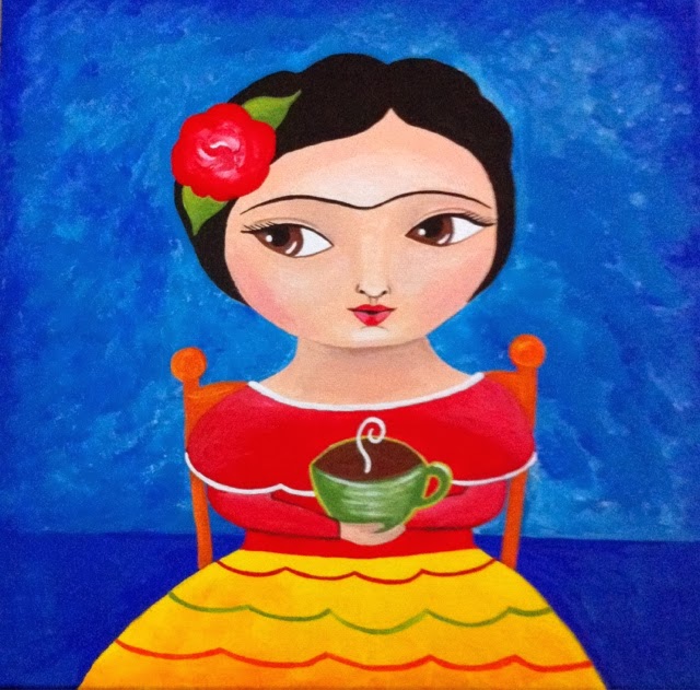 New original acrylic painting on canvas, Frida Kahlo having coffee,