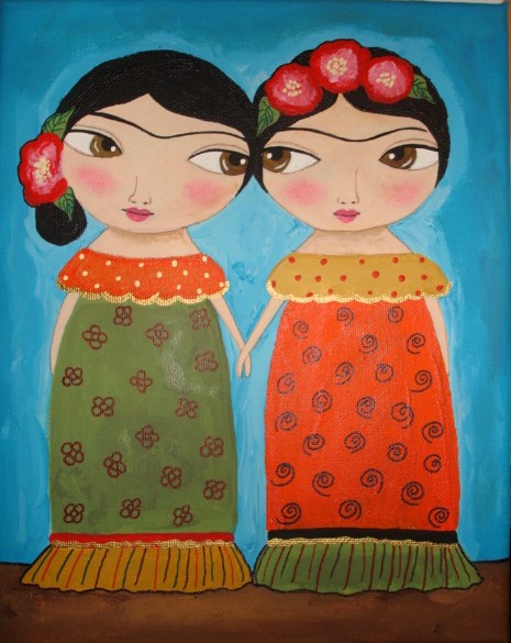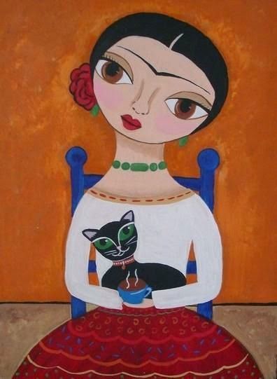 New original acrylic painting on canvas, Frida Kahlo having coffee,