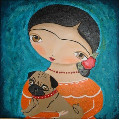 Adorable Frida Kahlo Folk Art with Pug Painting
